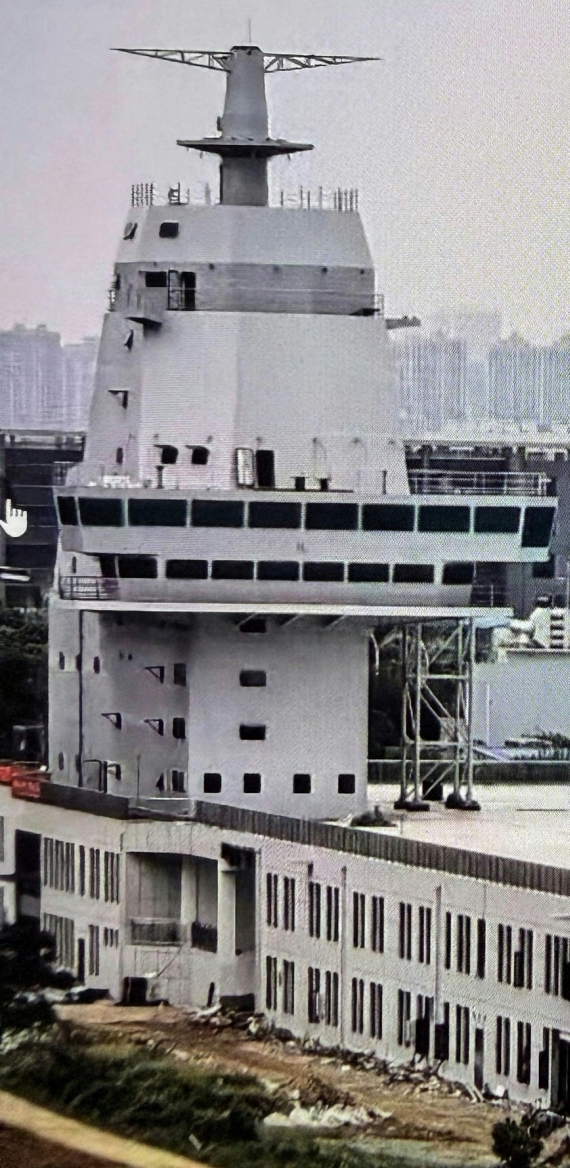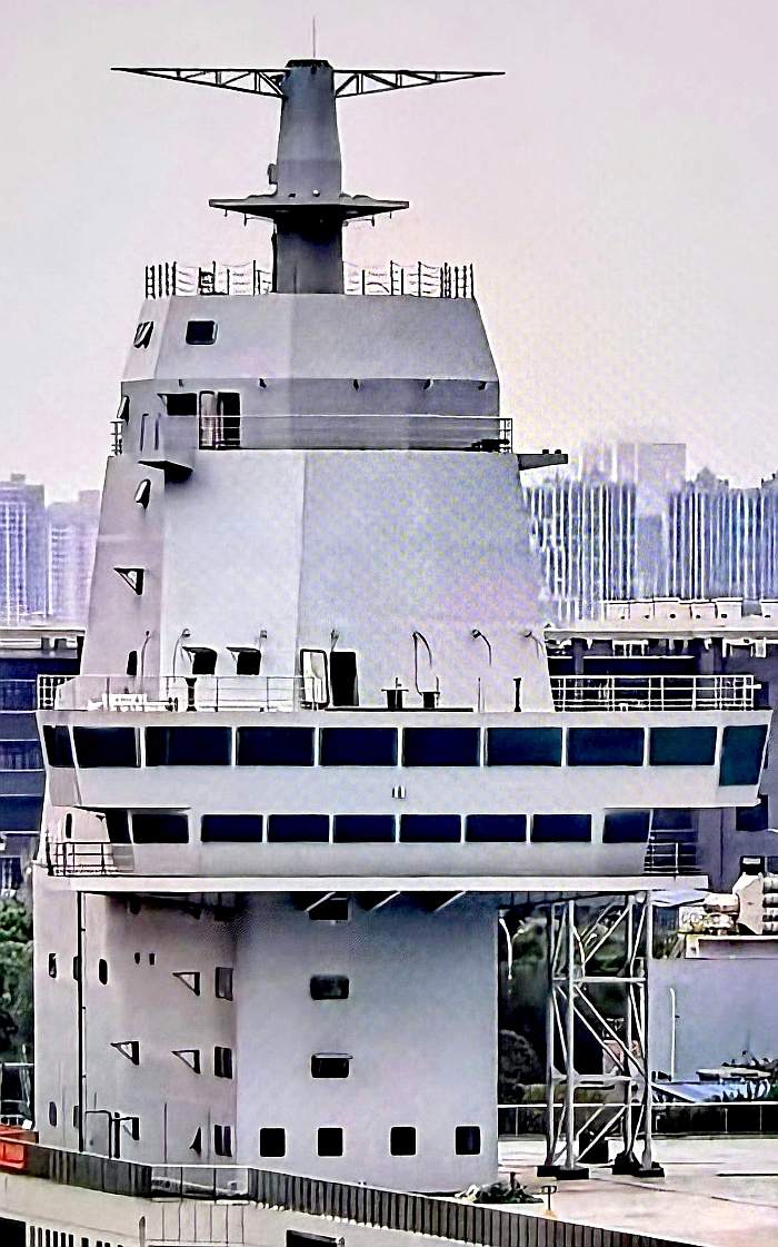 2025年10月初出現的武漢航母樓照片,新艦島已經完工並拆除腳 手架,體積比先前003航母的艦島小,同樣擁有相控陣雷達與集成桅杆; 艦島後方有一個比較低矮的分離的主機煙囪,這顯示004型航母可能仍 為常規動力。