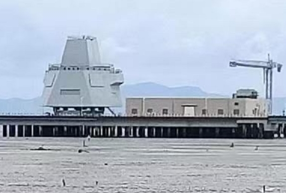 一座在海邊模擬導彈驅逐艦上層結構的建築。此為早期畫面,當時是用來 測試052C導彈驅逐艦的設備,如第一代的346型相控陣雷達。