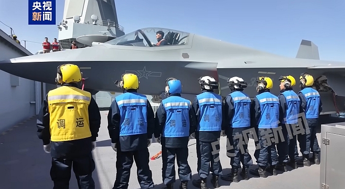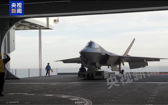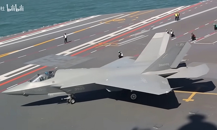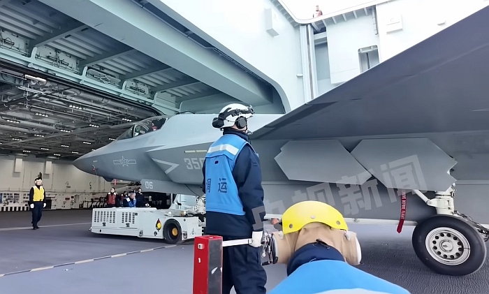 的畫面。此為殲-35艦載戰鬥機在甲板滑行的畫面。