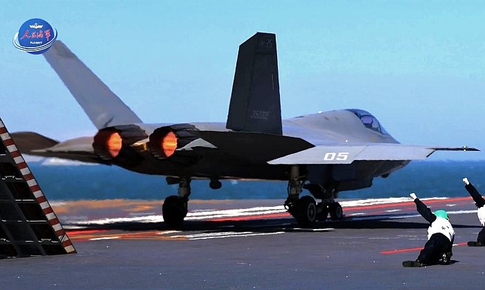 的畫面。此為殲-35戰鬥機艦艦載版降落觸艦瞬間。