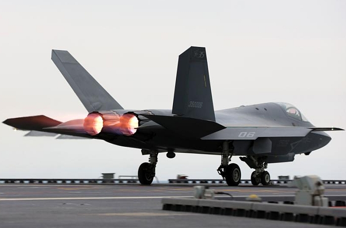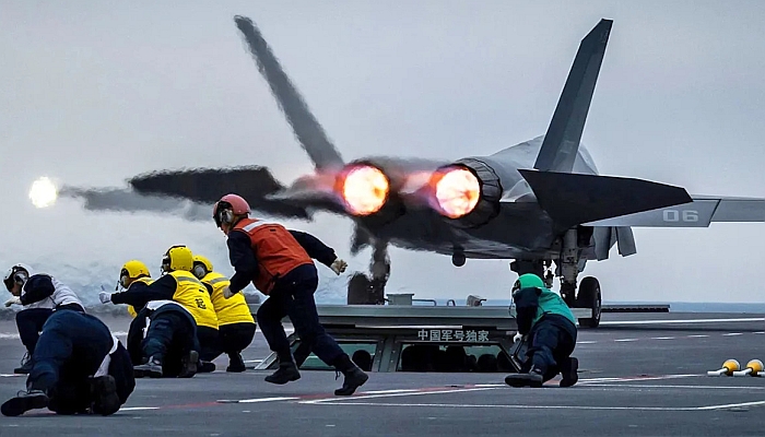 的畫面。此為殲-35艦載戰鬥機啟動後燃器、由電磁彈射器加速的畫面。