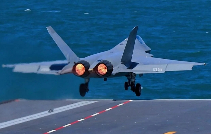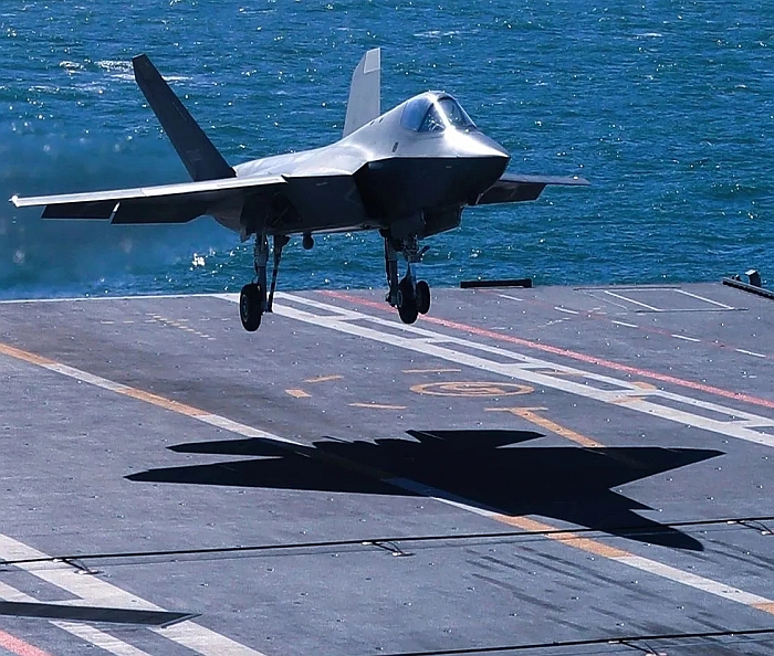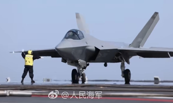 的畫面。此為殲-35戰鬥機艦載版著艦。