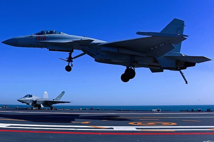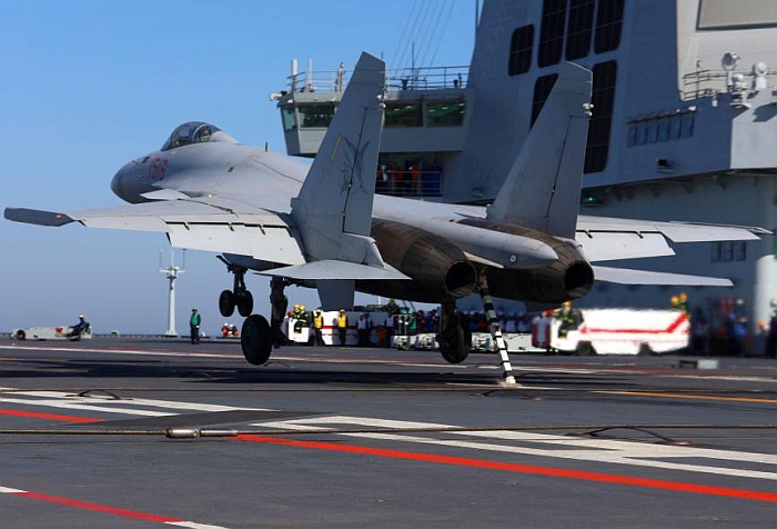 2015年12月下旬,中國海軍微博公布遼寧號的航母船艦、機隊聯合訓練畫面。畫面中降落甲板的J-15攜帶了