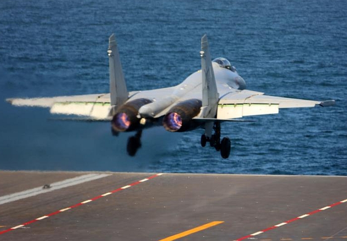 一張J-15戰鬥機圖,此時該機已經塗上中國海軍航空隊塗裝。