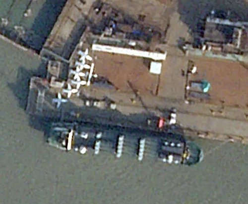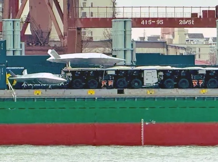 2025年12月底一張滬東中華船廠旁的碼頭衛星照,注意畫面左側 有6架具備後略翼的Type C無人機,還有一架類似翼龍的MALE無人機。 碼頭邊的集裝箱船「中達79號」裝載了各種集裝箱化武裝模塊。