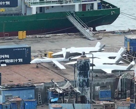 「中達79」附近碼頭的全尺寸無人機模型,前方有一架類似「翼龍」的 高展弦比、中高空長航時(MALE)無人機,後方是四架Type C噴射無人機。 一開始碼頭上有四架Type C,此時已經有兩架移到「中達79」的甲板上。