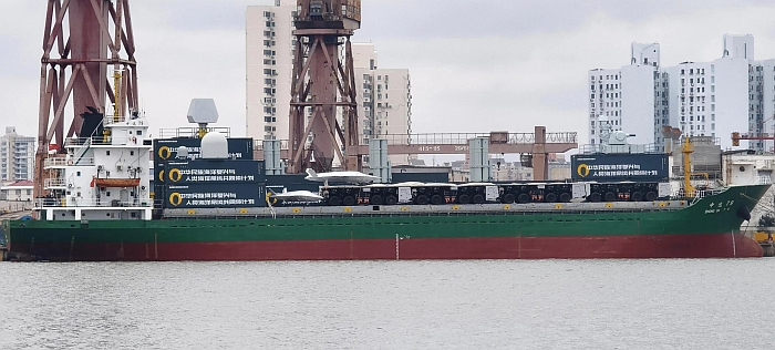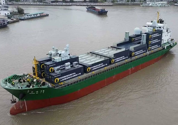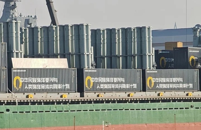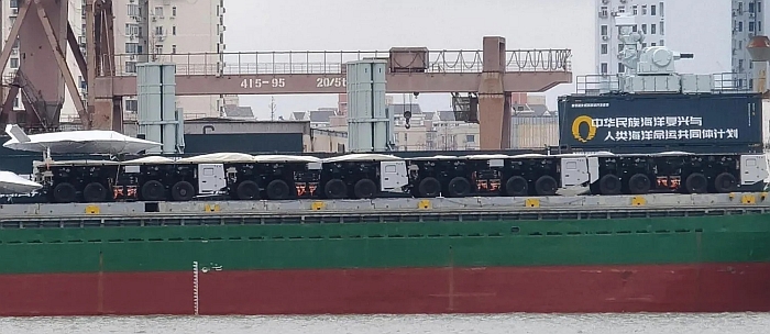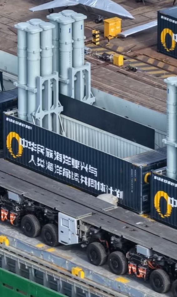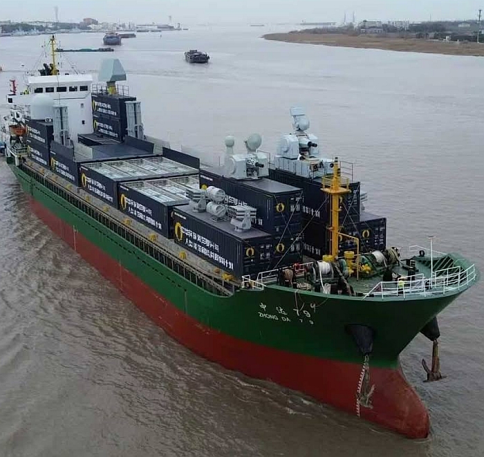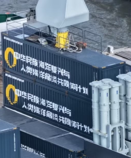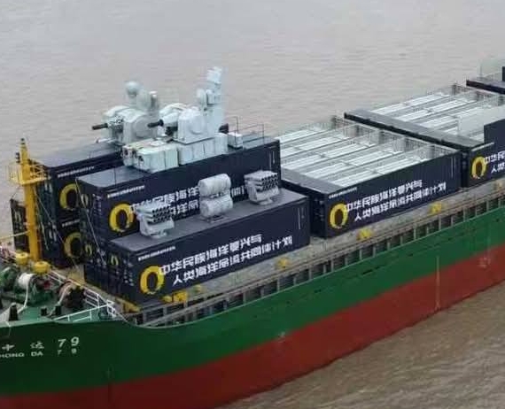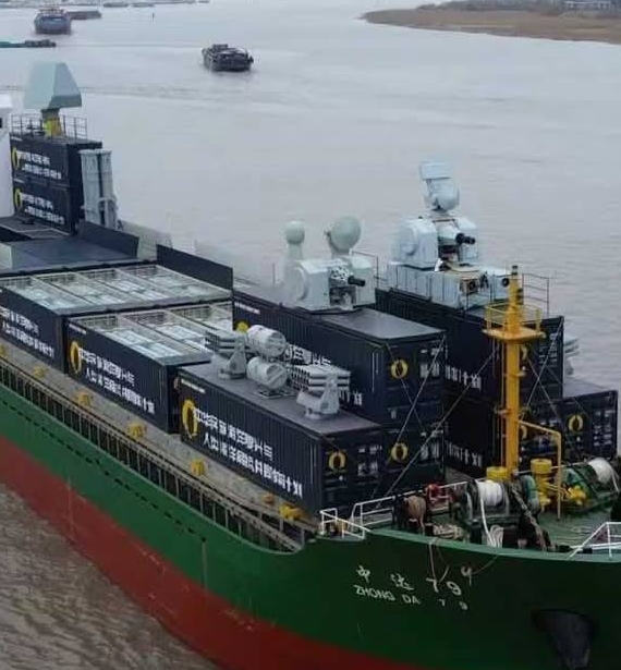 在2025年12月26日,網路上出現在上海滬東造船廠附近的長江水道船席上,有一艘「中達79」散貨船(載重噸5000噸),被發現甲板上裝載了大量40英尺集裝箱化(FEU)的艦載傳感器與武器系統模塊,使之具備幾乎相當於第一線防空護衛艦的主要作戰能力。
