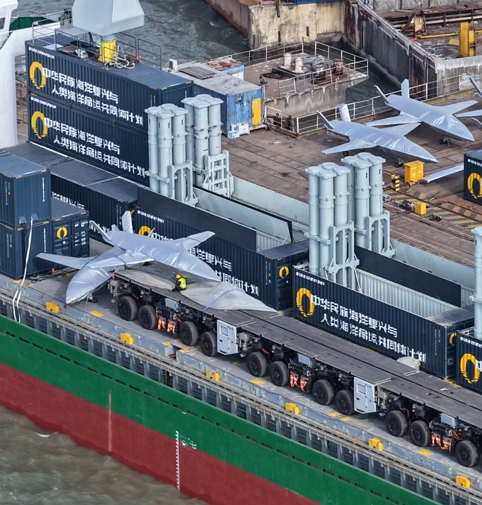 根據2025年12月底網路上出現的照片與衛星圖片,滬東中華造船廠附近的一個碼頭出現一些無人機,包括六架外界稱為「Type C」的無人噴射機,以及一架外型類似「翼龍」(Wing Loong)系列的高展弦比、中高空長航時(MALE)無人機;而畫面中正在試航階段的076兩棲攻擊艦四川艦(51)則停靠在在該碼頭附近的船塢裡。 Type C噴射無人機在同年9月3日「紀念中國人民抗日戰爭暨世界反法西斯戰爭勝利80周年閱兵式」上公開展示過,是近年衛星照片等信息觀察到的中國數種新型號噴射無人機之一,類似美國空軍發展的協同作戰飛機(Collaborative Combat Aircraft,CCA)項目,是一種配合有人戰鬥機的忠誠僚機(loyal wingman)。Type C具備雷達隱身特徵以及類似戰鬥機構型等特徵,包括後掠翼、背部進氣口、外傾雙垂直尾翼設計,設有內置彈艙,整體構型與美國Kratos的XQ-58A 女武神(Valkyrie)有些類似。 1.海軍武裝船艦構型 依照「中達79號」首波曝光的照片,艦上的武裝模塊包括: 1.船頭有一排共兩層的40英尺集裝箱模塊堆疊,包括頂上一個裝置1130型近防火砲,以及兩側各兩組726型24聯裝干擾火箭發射器(每個模塊裝置兩個726型干擾火箭發射器)。 2.隨後第二至第四排集裝箱是15個FEU集裝相舉升導彈發射模塊(每排五個)。每個FEU模塊裝置一組四聯裝大型導彈發射器,平時收容在集裝箱裡,發射前垂直舉升。因此,12個集裝箱總共容納60枚區域防空或反艦/對地打擊導彈,這樣的火力幾乎等於052D導彈驅逐艦。 3.設置在船樓前方的第五排40英尺集裝箱模塊也有兩層,包括一個類似054B導彈驅逐艦、076兩棲攻擊艦使用的S波段單面有源旋轉相控陣雷達,以及一個大型半球型天線罩(尺寸類似366型反艦導彈/火砲射控雷達)、小型球狀天線(可能是數據鏈或衛星通信)。 這些裝備模塊涵蓋了許多第一線正規水面船艦的能力,包括獨立搜索、鎖定目標的傳感火控系統,以及發射導彈攻擊空中乃至水面、地面目標的能力,此外還有數據鏈接收友軍戰場情資與目標數據的能力,從友軍平台的目標指引發動打擊。此外,還有近防火砲以及誘餌、電子戰等防空自衛能力。