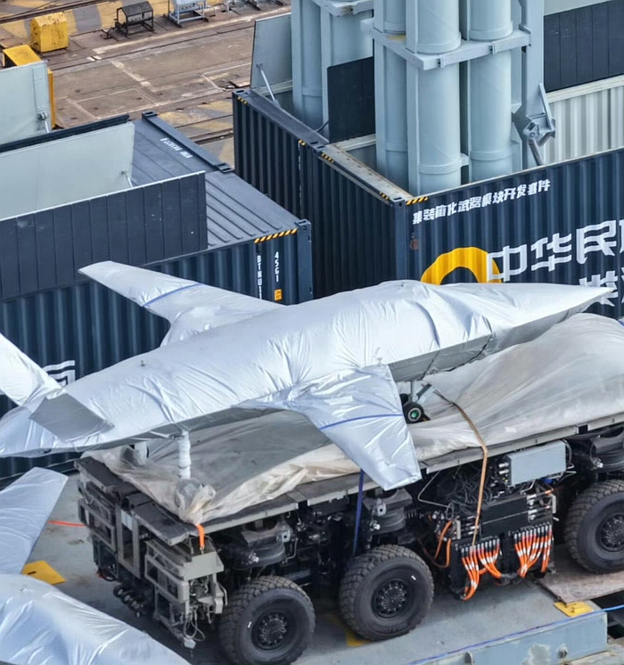 2.電磁彈射無人機構型 原本「中達79號」碼頭旁邊停放的Type C以及「翼龍」等無人機模型被認為是即將裝上076兩棲攻擊艦進行測試,然而幾天後碼頭邊隨即出現幾輛八輪載重車前後對接、上面搭載彈射器軌道(應為輕型電磁彈射器)的畫面,並且在彈射器上架設Type C無人機模型。 緊接著在2026年1月1日,距離「中達79號」照片首次曝光後約一星期,網路上照片顯示「中達79號」迅速變更了模塊構型:原本右舷的兩排共六個導彈發射器模塊(共24枚)以及干擾火箭模塊被撤除,換成由四輛八輪載重車拼接成彈射平台的無人機發射模塊,軌道末端搭載一架Type C無人機全尺寸模型。這種構型下,「中達79號」能迅速放出Type C這樣「忠誠僚機」等級的大型噴射無人機,但他們必須在大型平甲板船如076兩棲攻擊艦或岸上跑道降落。