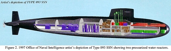 1997年美國海軍情報辦公室(ONI)的093攻擊核潛艇想像圖,主要特徵是兩部縱列 的壓水反應堆。 中國第二代潛艇的壓水反應堆的設計工作在法國的協助下於1995年展開,而加拿大在1998年提供的一些技術協助也有助益;此外,美國西屋電氣(Westinghouse)在這段期間曾向中國提供商用的AP600反應器技術,對於中國發展第二代核潛艇反應堆幫助」很大。 外界多半推測09III、09IV使用兩部熱功率各70MW~75MW(93871∼11577馬力) 的反應器帶動蒸氣渦輪,推進軸輸出功率約30000軸馬力,單軸推進。 聲納系統推測
