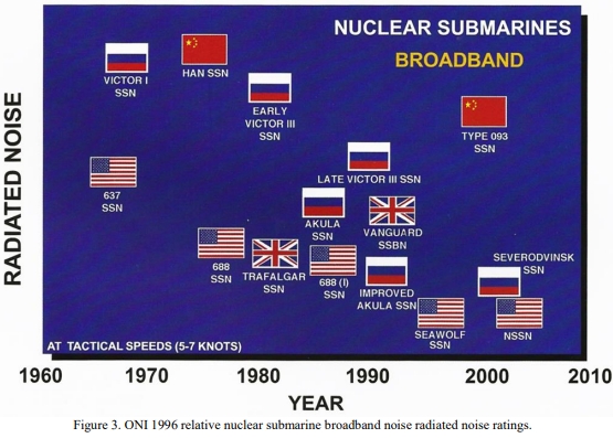 美國海軍情報辦公室(ONI)在2009年11月公布的中國海軍報告中,關於中國核能潛艇靜音能力評比的圖表。由此可見
