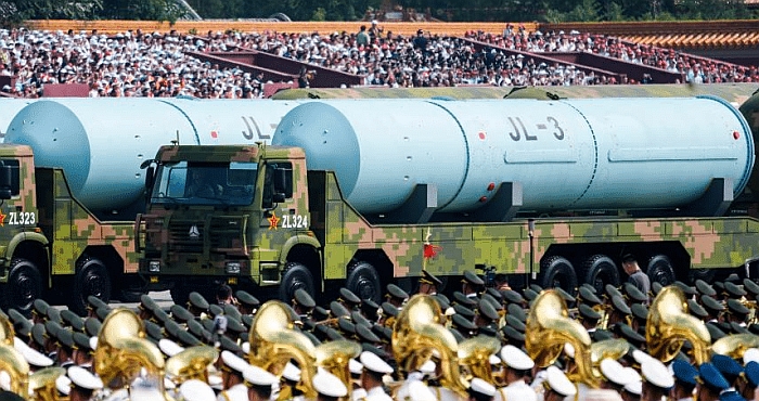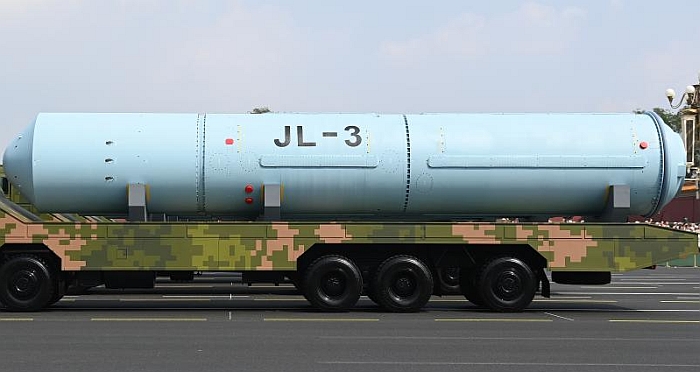 (上與下)2025年9月3日抗戰勝利80週年閱兵上展出的巨浪-3(JL-3)潛射彈道導彈