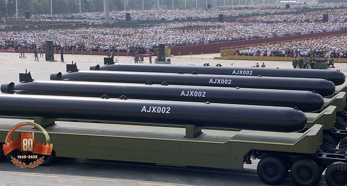 (上與下二張)2025年9月3日閱兵式中,中國首次展出編號AJX-002的超大型水下載具,