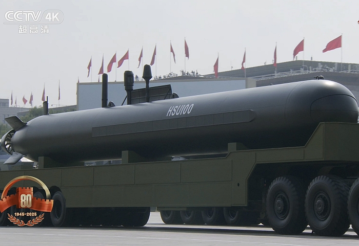 2025年9月3日抗戰勝利80週年閱兵上展出的HSU-100超大型水下無人載具,外型與1月在