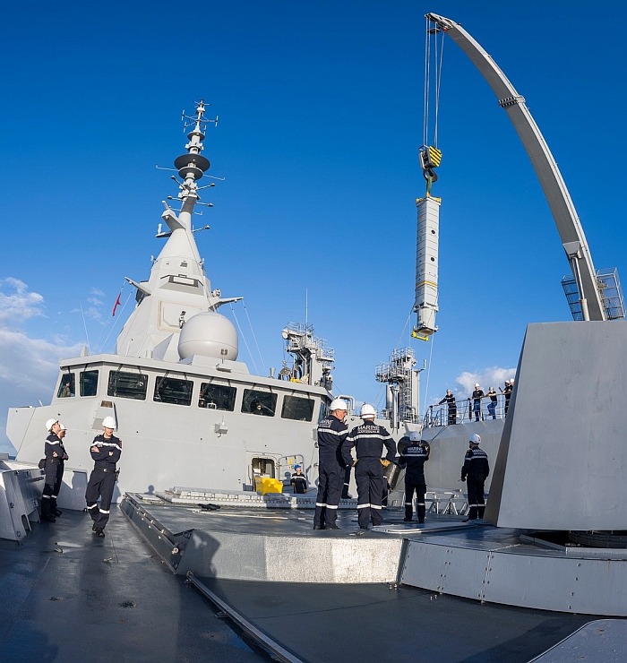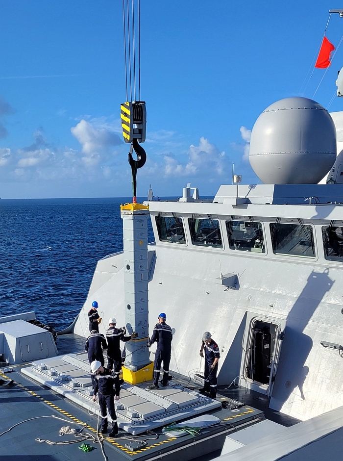(Jacques Chevallier)補給艦實施海上VLS再裝填作業。這是在平靜水域,兩船靜止並排時進行。