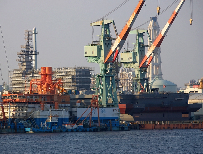 接近下水的22DDH首艦,攝於2013年7月13日。由於海自幕僚監部文書作業疏失,原本應該在