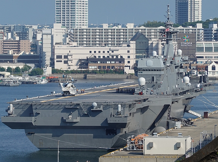 從後方看停泊在橫須賀基地逸見岸壁的加賀號(DDH-184),此時直昇機甲板上有一架