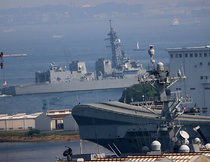 村雨號正駛出橫須賀軍港。前景是停靠訪問的英國威爾斯親王號(HMS Prince of Wales R09)