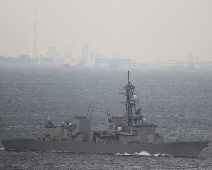 (上與下)村雨級的曙號(DD-108)正駛入東京灣。背景是東京晴空塔;該艦航行在從東京啟航的英國
