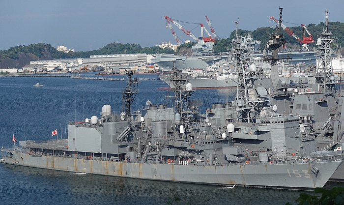 夕霧號停泊在橫須賀基地,後方有高波號(DD-110)、摩耶號(DDG-179)等艦。