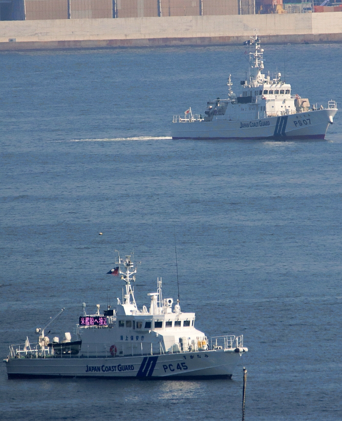 兩艘海上保安廳巡視船正在橫須賀軍港戒護剛剛停入泊地的美國海軍華盛頓號