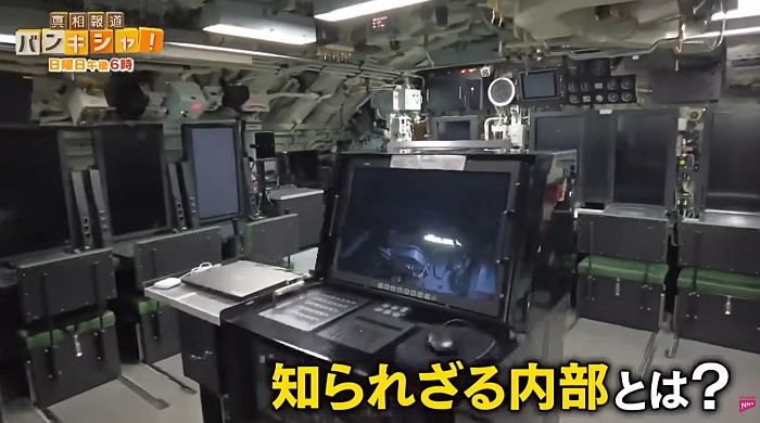 大鯨級的作戰控制室內部,中央是控制光電潛望鏡的顯控工作站,周遭所有航行或作戰操作工作站