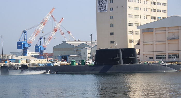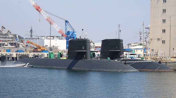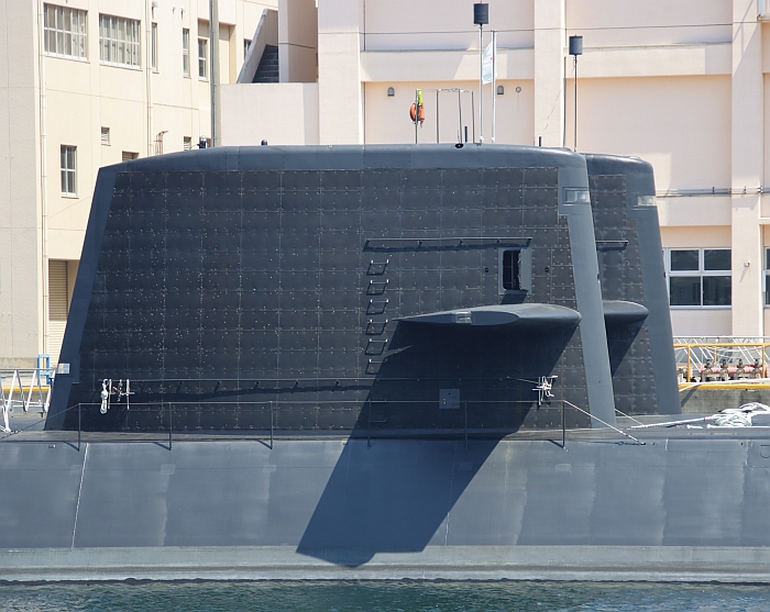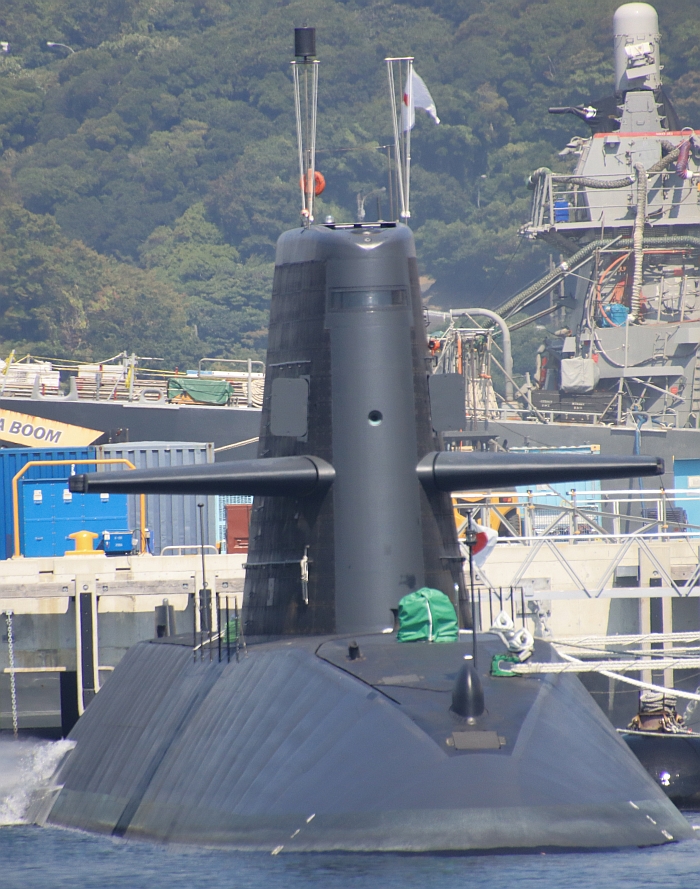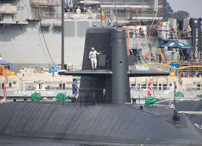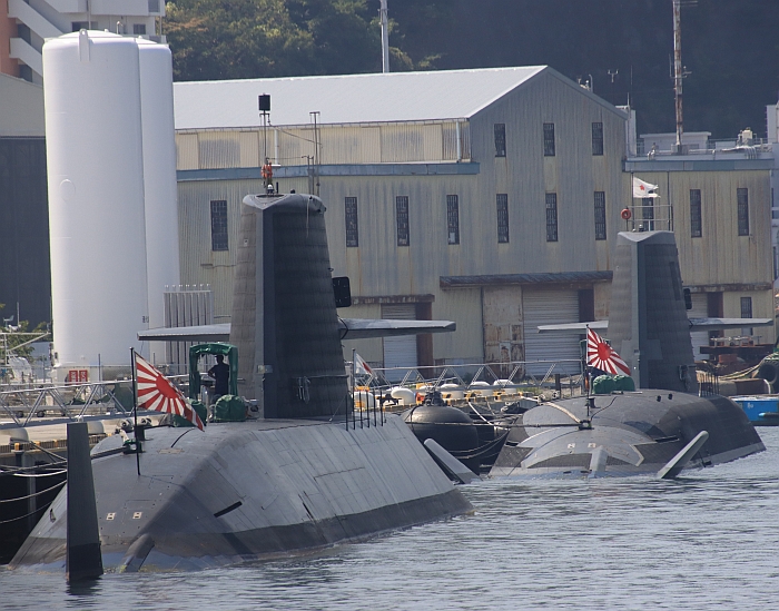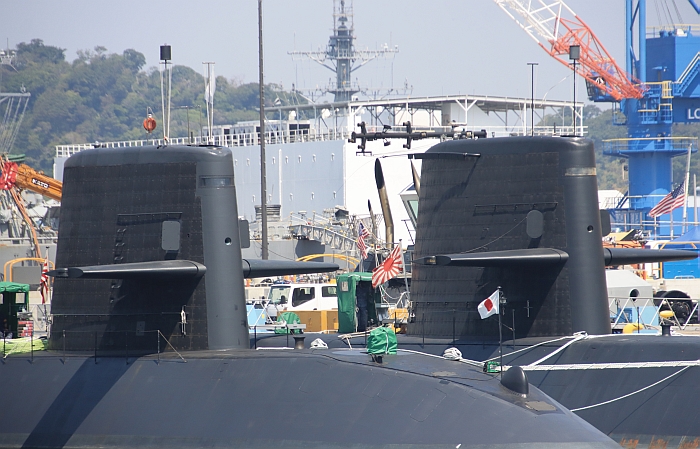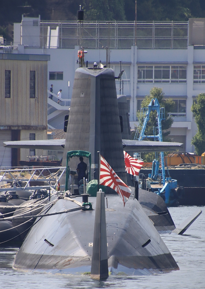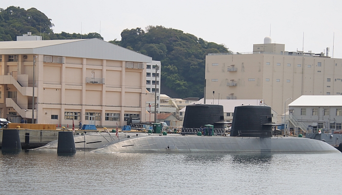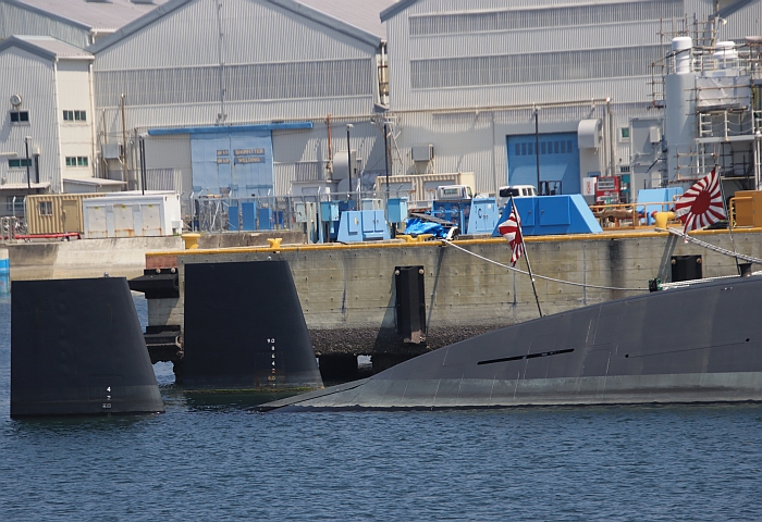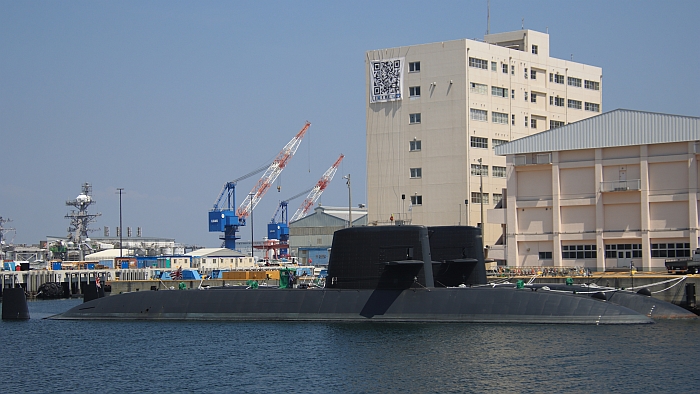 (上與下)一艘停泊在橫須賀基地的親潮級潛艦;注意岸邊的兩個白色物體是史特靈AIP推進系統所需的
