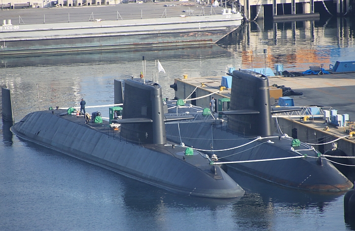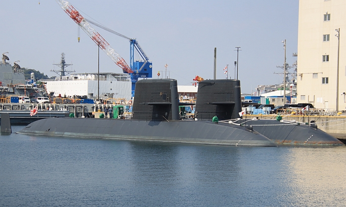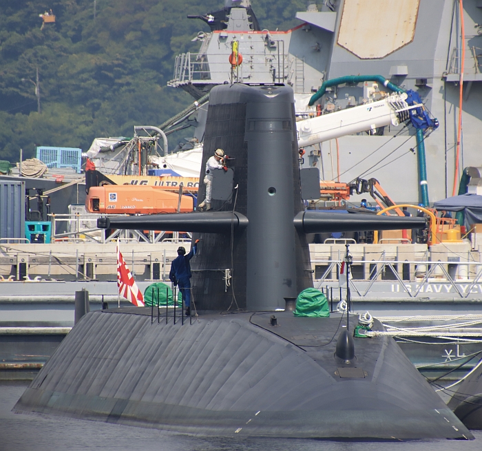 兩艘親潮級停靠橫須賀基地,外檔的一艘伸出潛望鏡跟通氣管。攝於2025年8月25日。