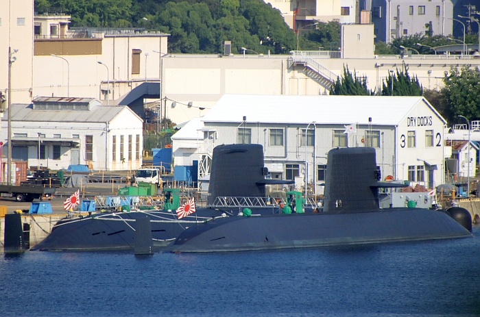 停泊中的海自潛水艦群,左兩艘為親潮級,最右邊為春潮級。背景是愛宕級飛彈驅逐艦愛宕號(DDG-177)