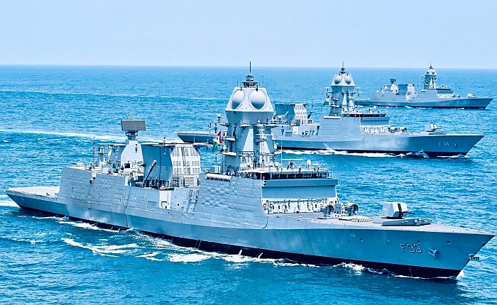前三艘納扎里級納扎里號(F33)、INS Himgiri(F34)與INS Udaygiri(F35)一同編隊航行,攝於2025年9月。