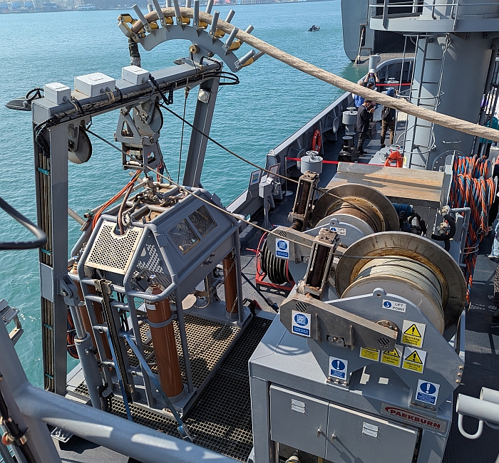 的收放絞盤;上方可以看到拉進潛水鐘的臍帶,包括輸氧管、電纜線等。攝於2025年11月22日。