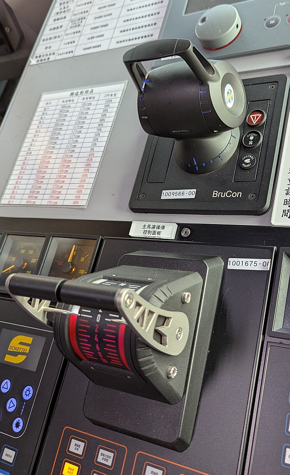 大武艦的駕駛台。舵輪左側兩個搖桿是用來分別單獨控制左、右舵機; 而畫面右側兩個橫向搖桿分別是艦首與艦尾橫向推進器的控制桿。 攝於2025年11月22日。