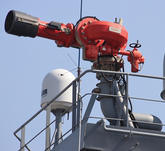 大武艦艦橋上方的MK-9消防水砲,艦橋頂部兩側各有兩座。
