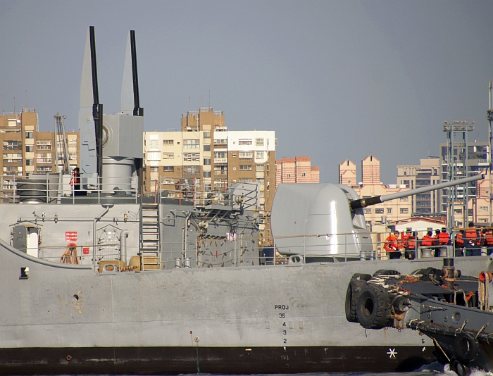 左營號(DDG-1803 ex-USS Kidd DDG-993)艦尾,可以看到MK-45 五吋54倍徑艦砲與MK-26雙臂飛彈發射器。