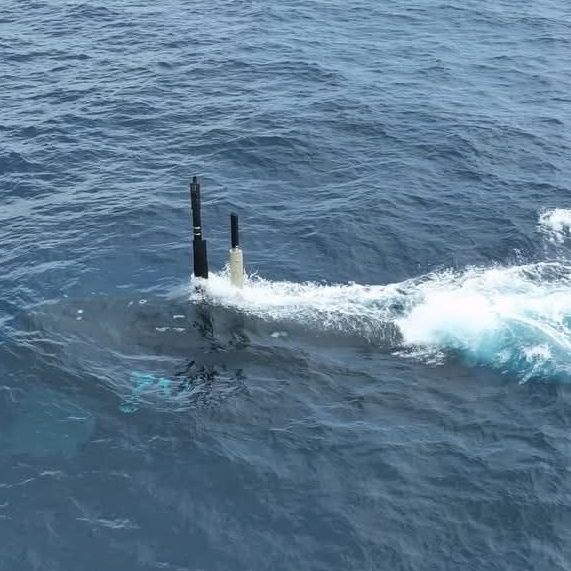 2026年1月29日,海鯤艦首次進行潛航測試時上浮中的畫面,潛望鏡先升出海面。