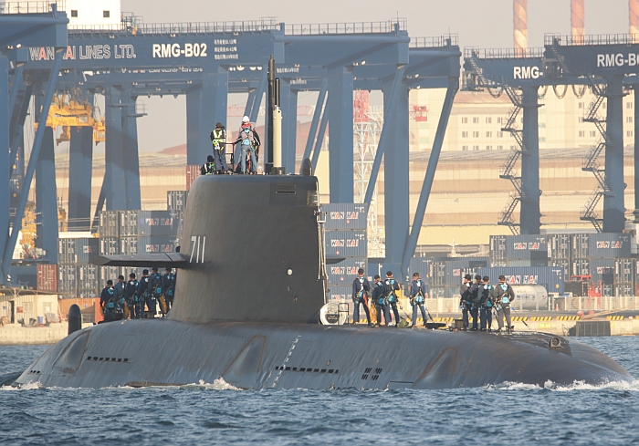 正駛向高雄港出海口的海鯤艦。攝於2026年3月12日上午8時第六次潛航測試出海。