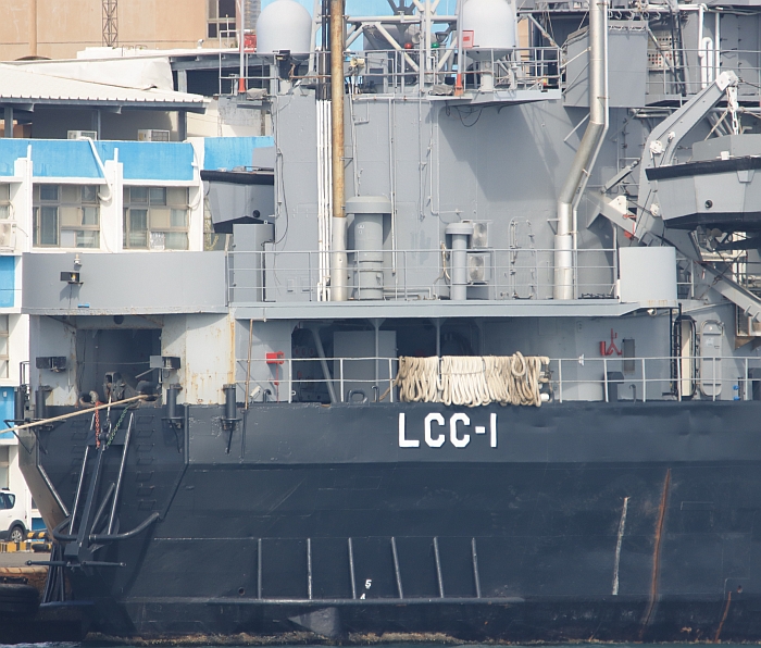 由側面看高雄號(LCC-1)後部船體以及船樓。攝於2015年10月24日。