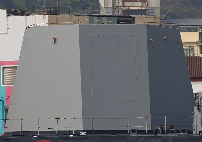 高雄艦前部甲板用來裝載中科院相位陣列雷達的「八角塔」,此時雷達已經拆除。