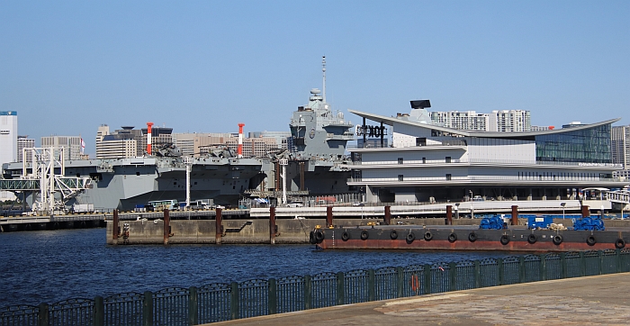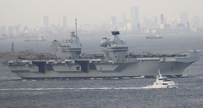 結束日本訪問的威爾斯親王號(HMS Prince of Wales R09)從東京出發,注意背景是東京晴空塔。