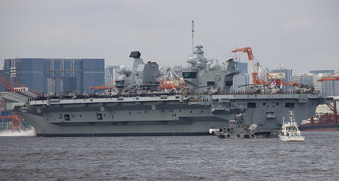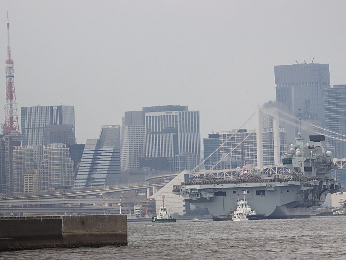 (上與下二張)2025年8月28日,威爾斯親王號(HMS Prince of Wales R09)駛入東京灣。攝於東京城南島。