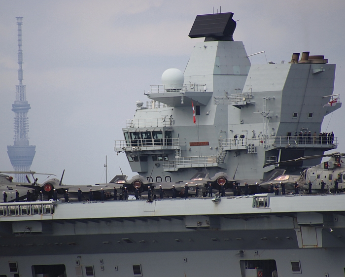 (上與下)威爾斯親王號(HMS Prince of Wales R09)的後部艦島。攝於2025年8月29日東京城南島。