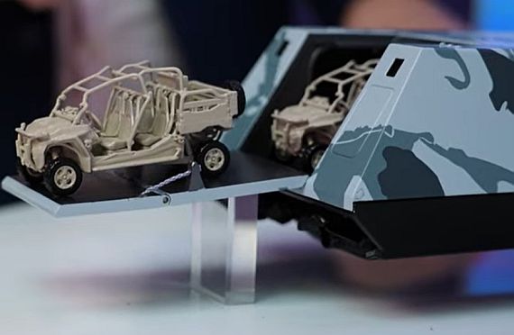 DSEI 2025上Leidos展出的「海匕首」想像圖,封閉式籌載艙可搭載輕型突擊輪車,從載具