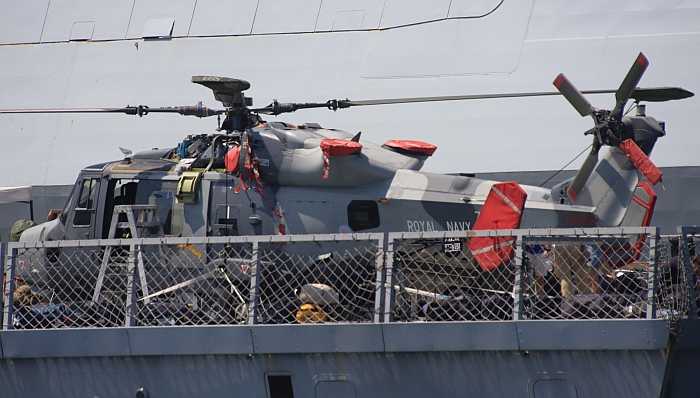 停在挪威南森級巡防艦羅爾德.阿蒙森號(HNoMS Roald Amundsen F311)的皇家海軍野貓反潛直昇機。