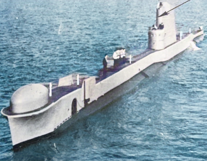 浮航中的皇家海軍妖王級貓豹號(HMS Ocelot S-17)。此時艦首上方裝置的是 服役初期的Type 187主動聲納,後來被Type 2051取代。