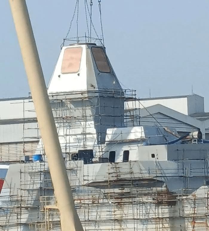 2025年12月2日PT Pal船廠建造中的首艘印尼MPF140巡防艦Merah Putih號的船樓與整合桅杆系統,