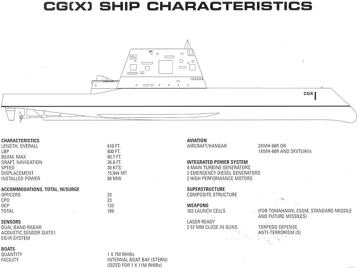 DDG-1000衍生版 根據詹氏防衛週刊2004年5月19日的報導,美國海軍打算以DD(X)陸攻驅逐艦(後來改稱DDG-1000)的基本設計為基礎,直接衍生出CG (X),以盡可能加快進度。 在2006年4月6日美國海上系統司令部艦體計畫辦公室的漢米爾頓少將(Charles Hamilton II)於眾議院武力投射委員會報告時,透露美國海軍構想的CG(X)以DDG-1000的艦體與推進系統為基礎,移除兩座AGS艦砲,裝備更多垂直發射器,包括直徑更大、用來容納反彈道飛彈的動能攔截器(Kinetic Energy Interceptor,KEI)的發射管,並且配備比DDG-1000更先進、更強大、針對彈道飛彈防禦任務而設計的新相位陣列雷達系統,此雷達在2007年初正式立項,稱為對空與飛彈防禦雷達(Air and Missile Defense Radar,AMDR )。 CG(X)有五大設計要求指標: