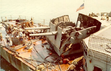 克勞德.瑞克特號飛彈驅逐艦上的人員與貝克納普號上的火災奮戰;畫面中可以看到 貝克納普號側舷被摧毀的MK-33 3吋快砲殘骸;在滅火過程中,貝克納普號的3吋快砲彈艙 發生爆炸,碎片波及克勞德.瑞克特號,造成許多人員受傷。