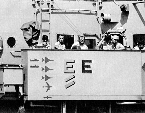 洞海戰役後,史泰瑞號(USS Sterett DLG-31)艦橋側面漆上的戰績; 四架軍機之中,有三架是2月到3月間該艦引導美國空軍戰機擊落, 一架是洞海戰役美軍認定擊落(但實際上應該沒有擊落)。另外還 畫有該艦在洞海戰役宣稱擊落的一枚冥河反艦飛彈與兩艘P-6魚雷艇, 但這些應該都是誤報。