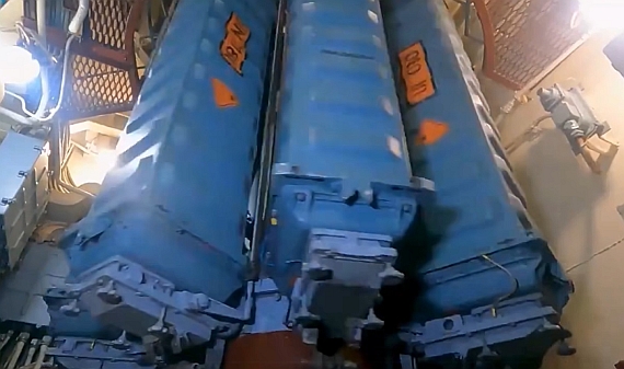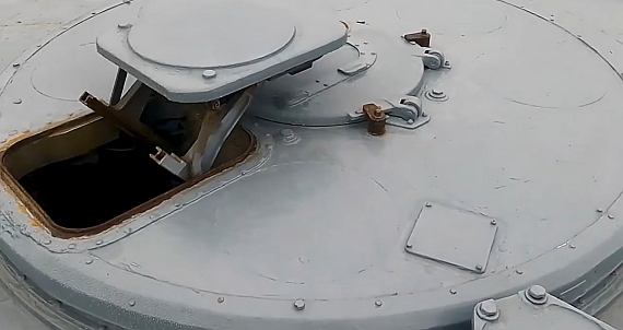蘇聯RIF-M防空飛彈的「轉輪式」垂直發射器旋轉彈艙內部畫面。 彈艙中間的柱子是旋轉軸,驅動旋轉的機構在底下;導彈發射管掛在 中心轉軸的周圍,透過轉軸轉動而輪流對準發射器開口。