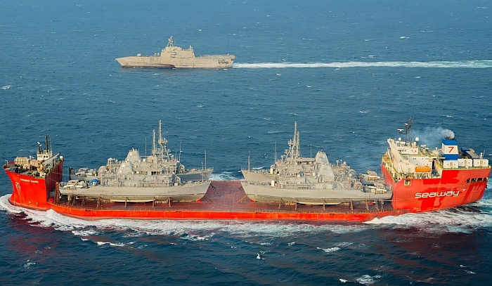 潛舉船M/V Seaway Hawk裝載運回美國東岸拆解;照片中,獨立級濱海作戰船艦堪培拉號